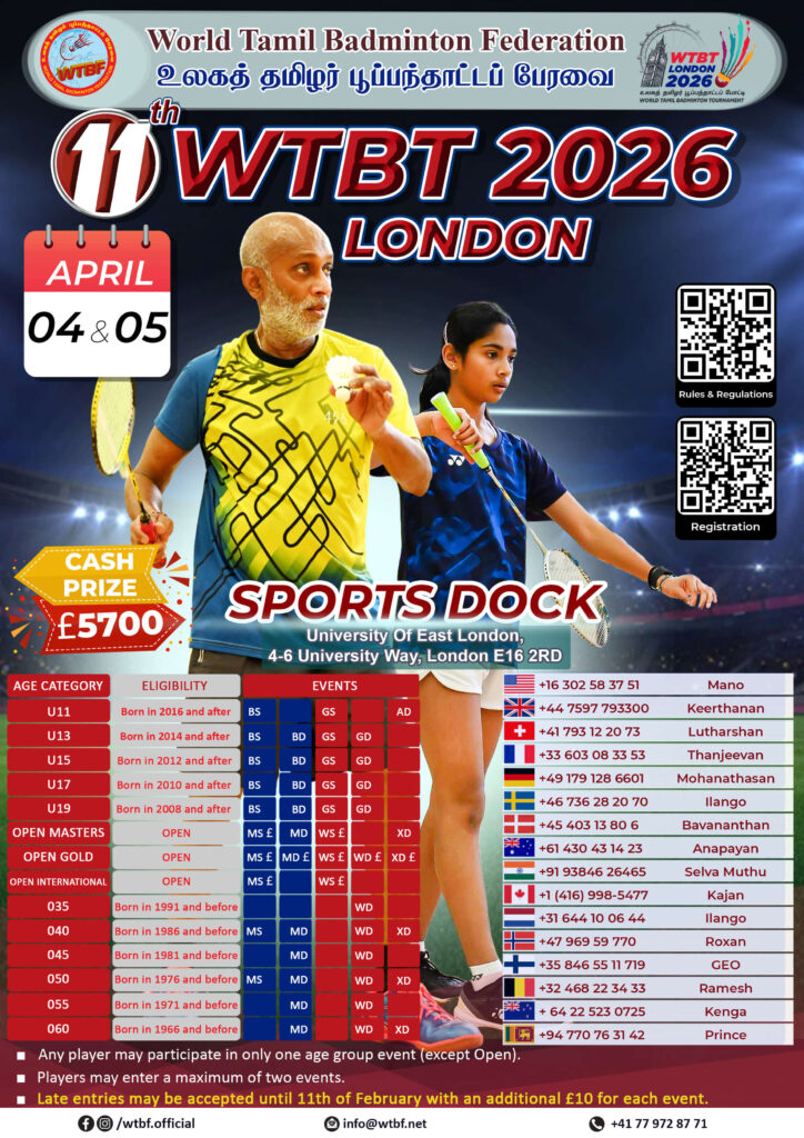 Here you can download the latest flyer with all information about the WTBT World Tamil Badminton Tournament in Argentan:
